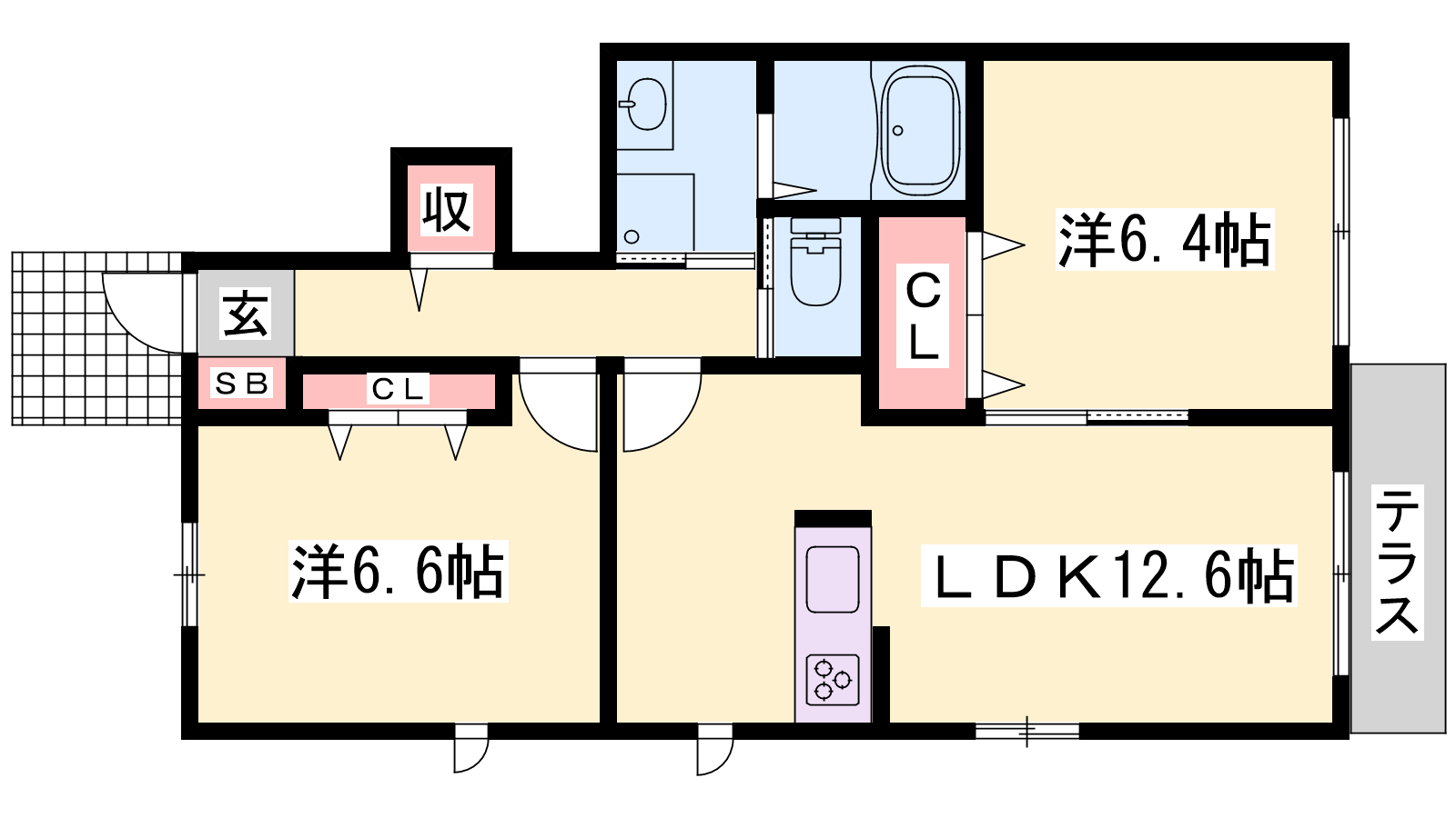 - LDK12.6帖、洋室6.6帖、洋室6.4帖