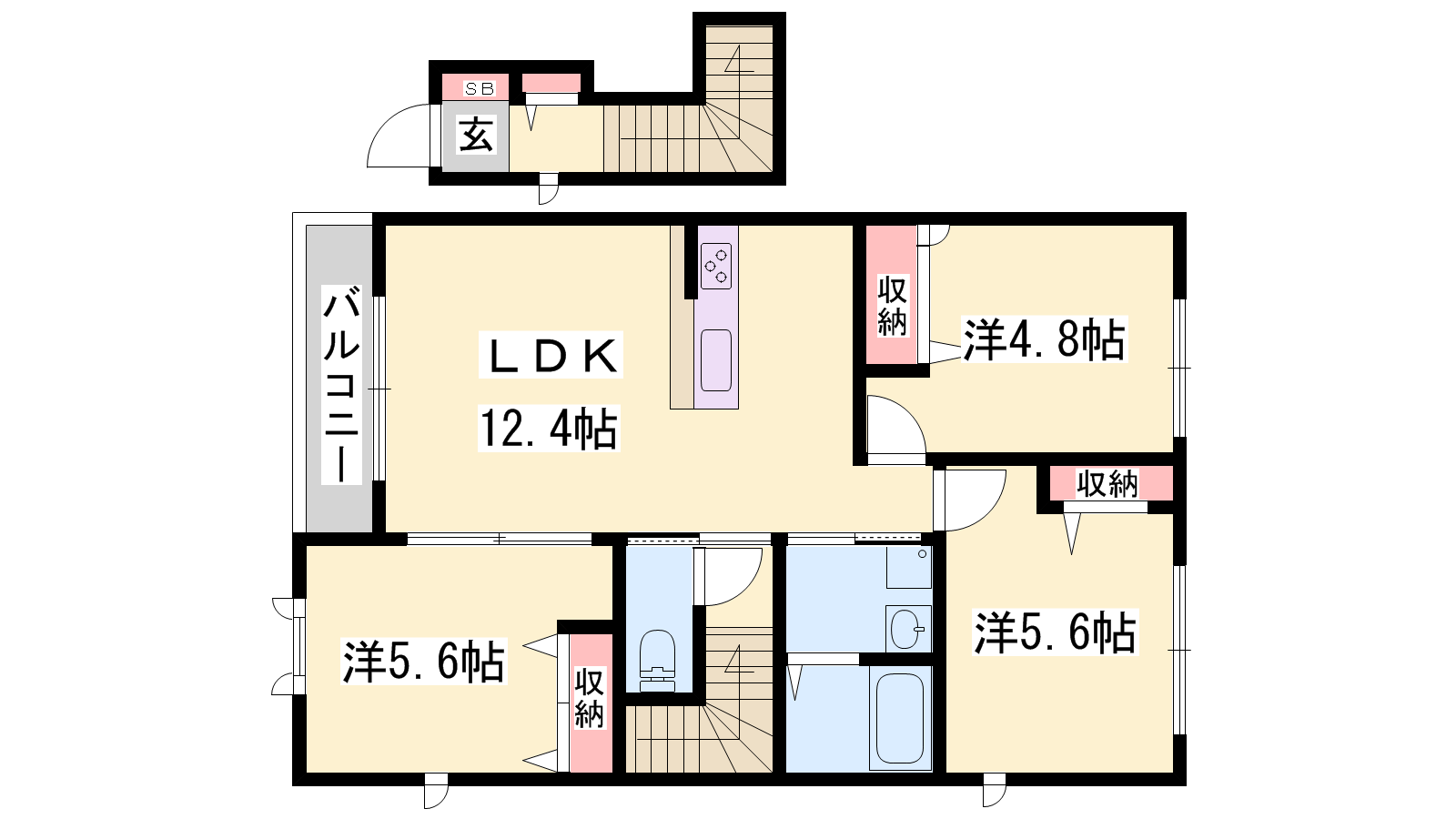 - LDK12.4帖、洋室5.6帖、洋室5.6帖、洋室4.8帖