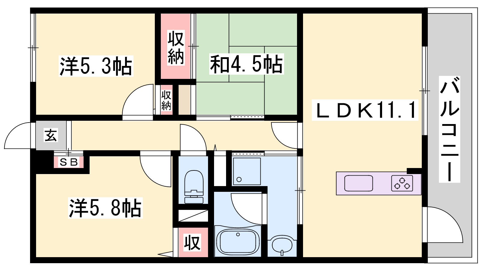- LDK11.1帖、洋室5.8帖、洋室5.3帖、和室4.5帖