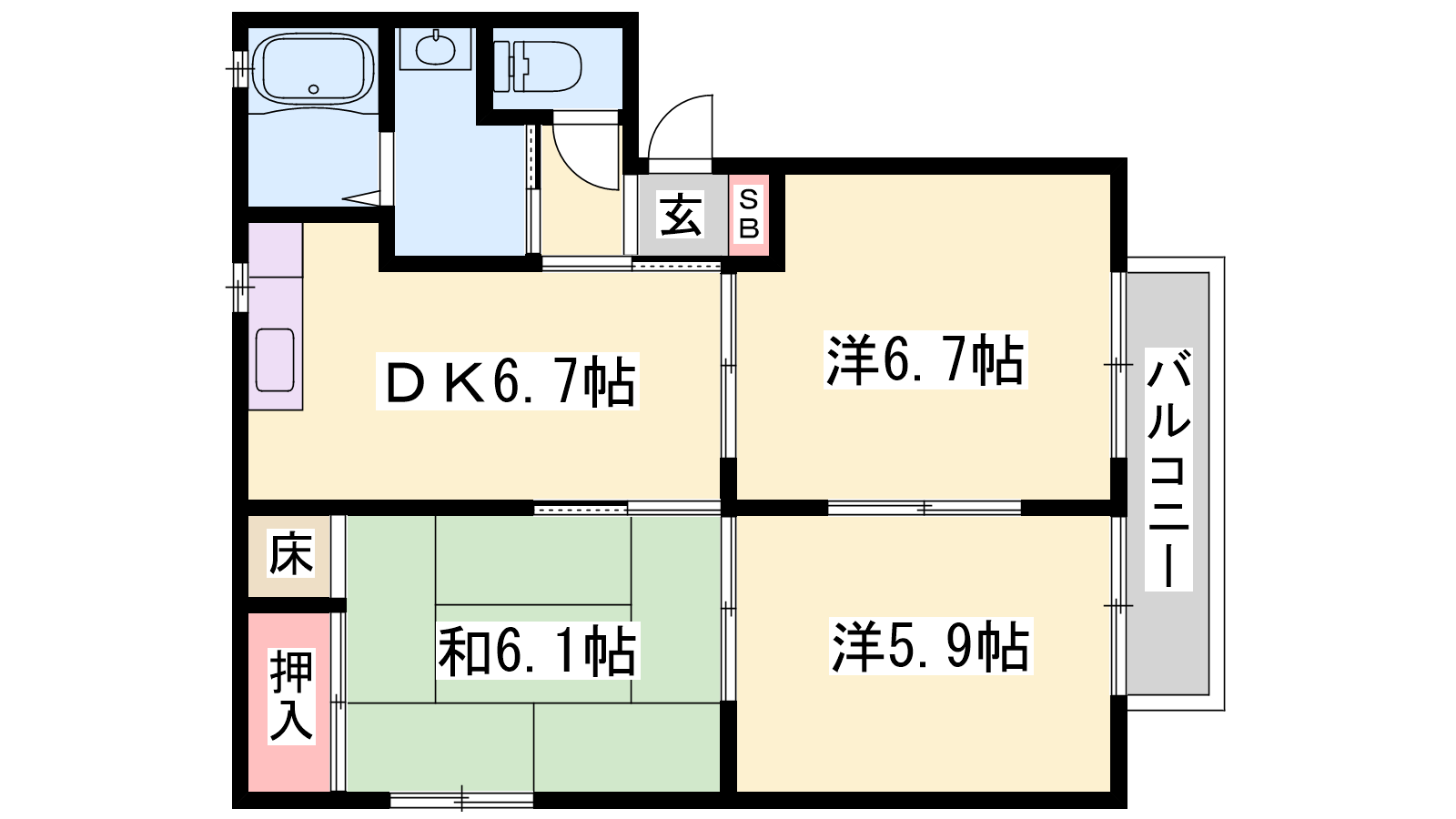 - DK6.7帖、洋室6.7帖、洋室5.9帖、和室6.1帖
