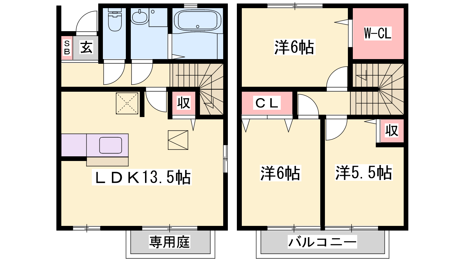 - LDK13.5帖、洋室6帖、洋室6帖、洋室5.5帖