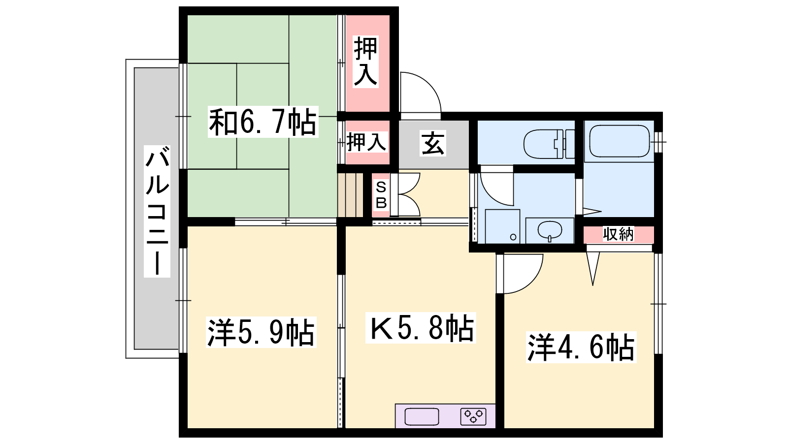 - K5.8帖、洋室5.9帖、洋室4.6帖、和室6.7帖