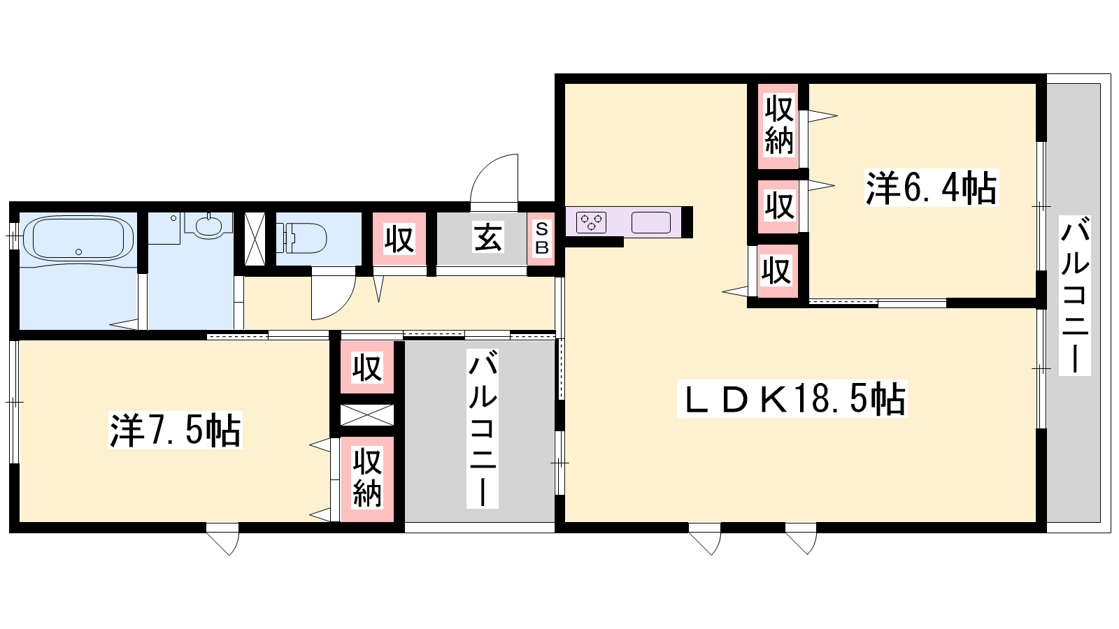 - LDK18.5帖、洋室7.4帖、洋室6.4帖