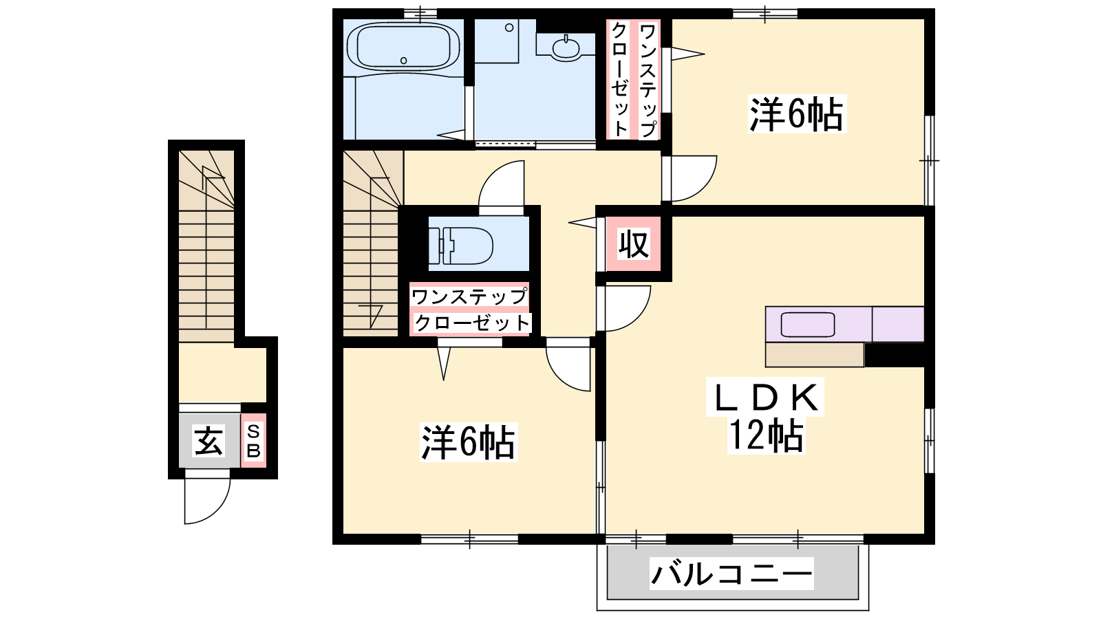 - LDK12帖、洋室6帖、洋室6帖