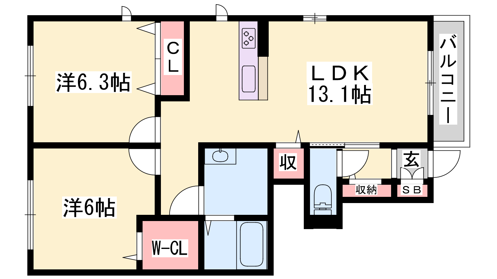 - LDK13.1帖、洋室6.3帖、洋室6帖