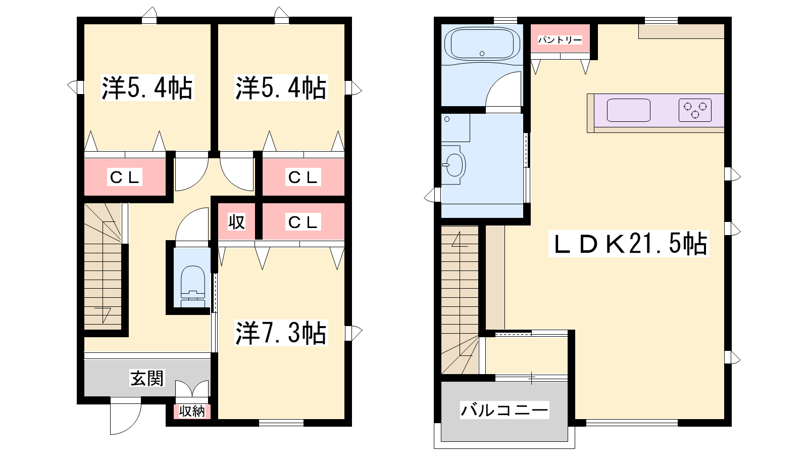 - LDK21.5帖、洋室7.3帖、洋室5.4帖、洋室5.4帖