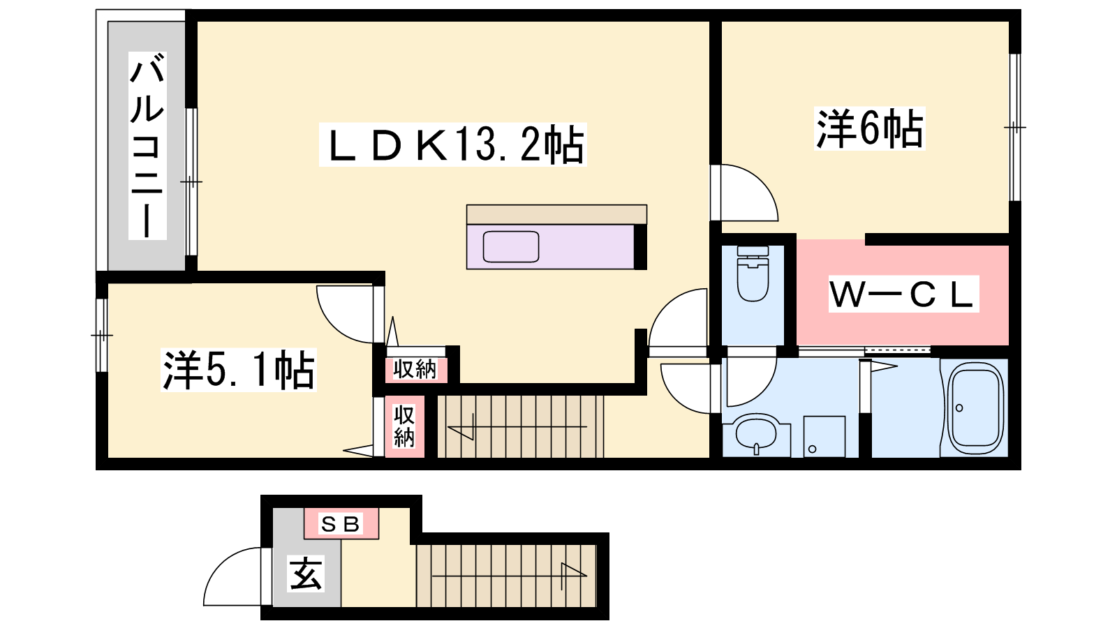- LDK13.2帖、洋室6帖、洋室5.1帖