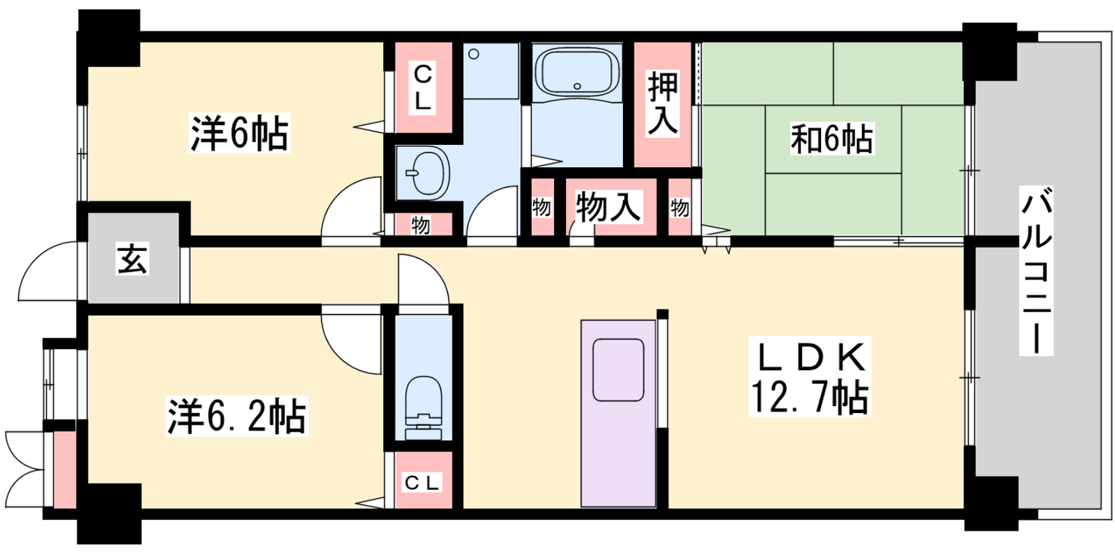 - LDK12.7帖、洋室6.2帖、洋室6帖、和室6帖