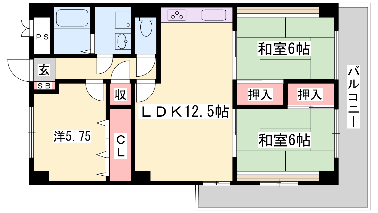- LDK12.5帖、和室6帖、和室6帖、洋室5.75帖