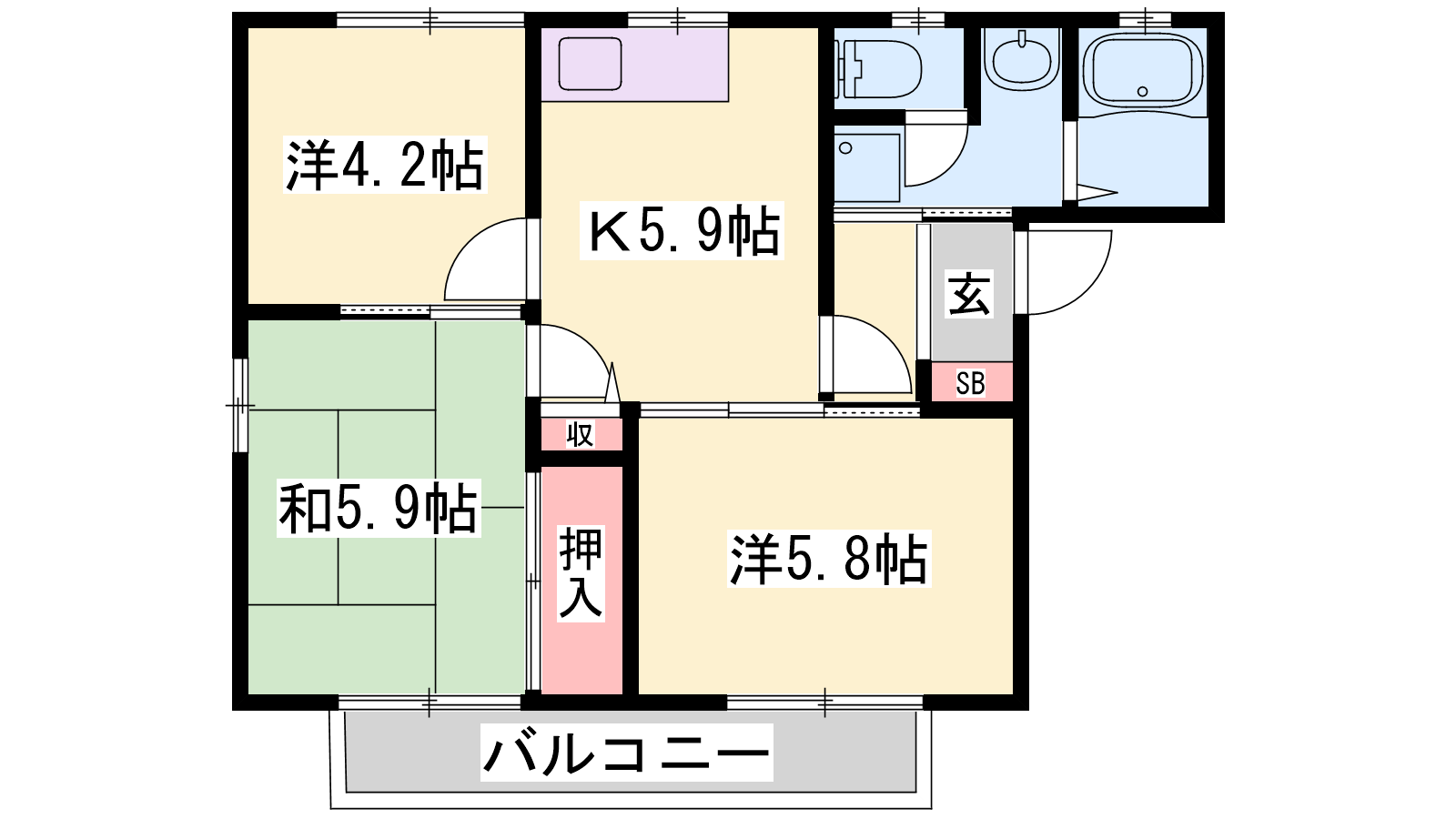 - K5.9帖、和室5.9帖、洋室5.8帖、洋室4.2帖