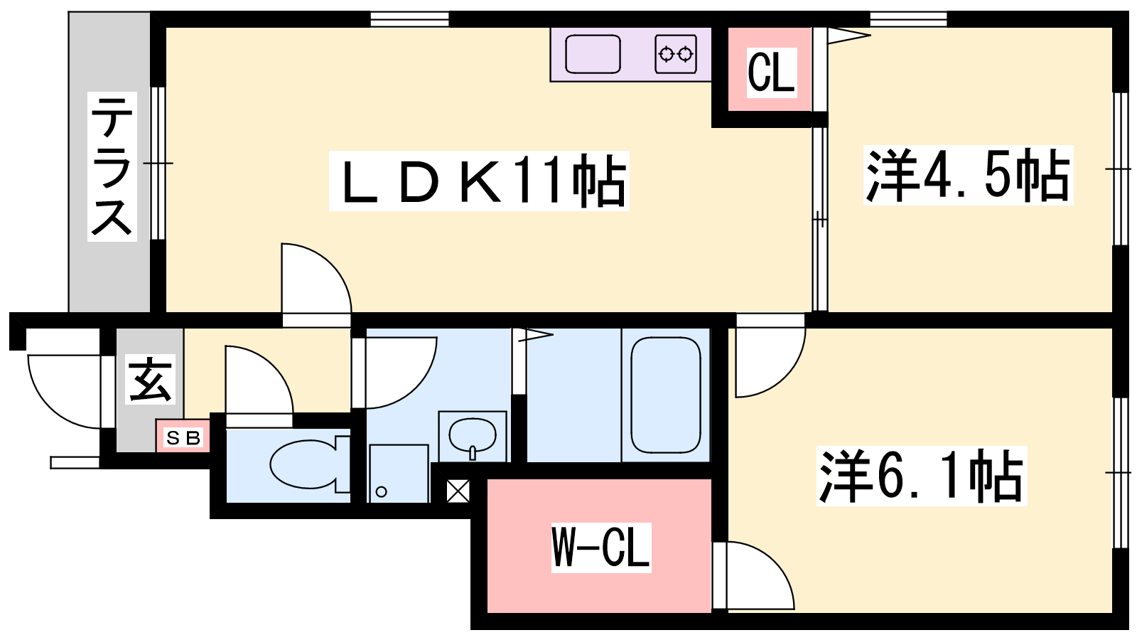 - LDK11帖、洋室6.1帖、洋室4.5帖