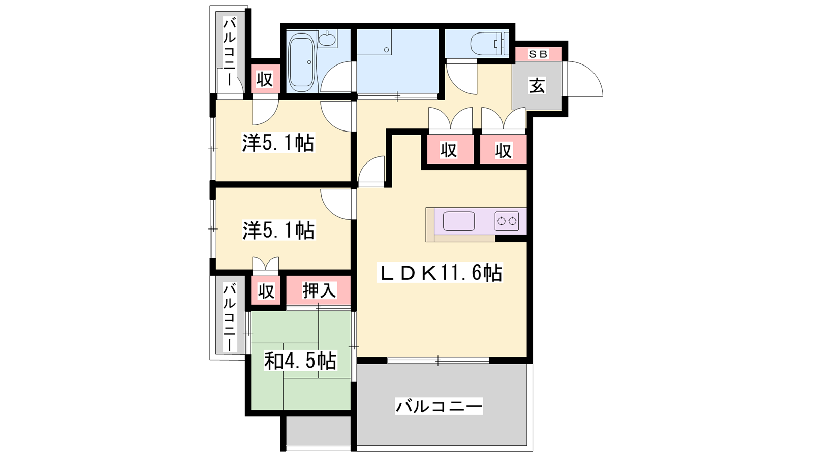 - LDK11.6帖、洋室5.1帖、和室4.5帖、S5.1帖