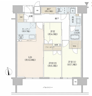 - LDK12.8帖、洋室5.5帖、洋室4.5帖、洋室7.3帖