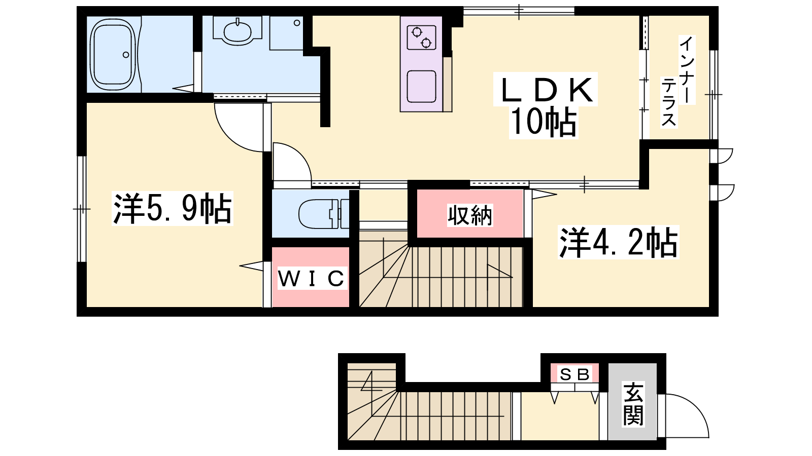 - LDK10帖、洋室5.9帖、洋室4.2帖