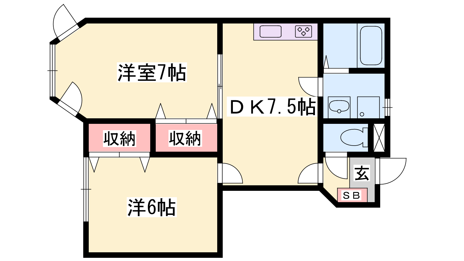 - DK7.5帖、洋室7帖、和室6帖