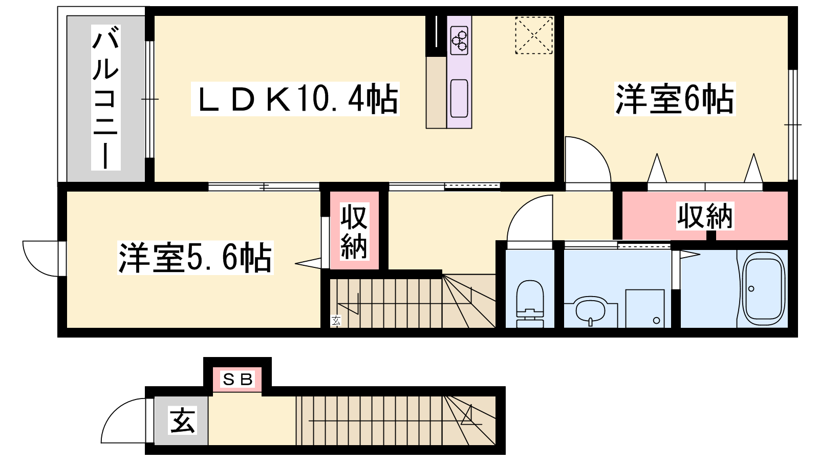 - LDK10.4帖、洋室6帖、洋室5.6帖