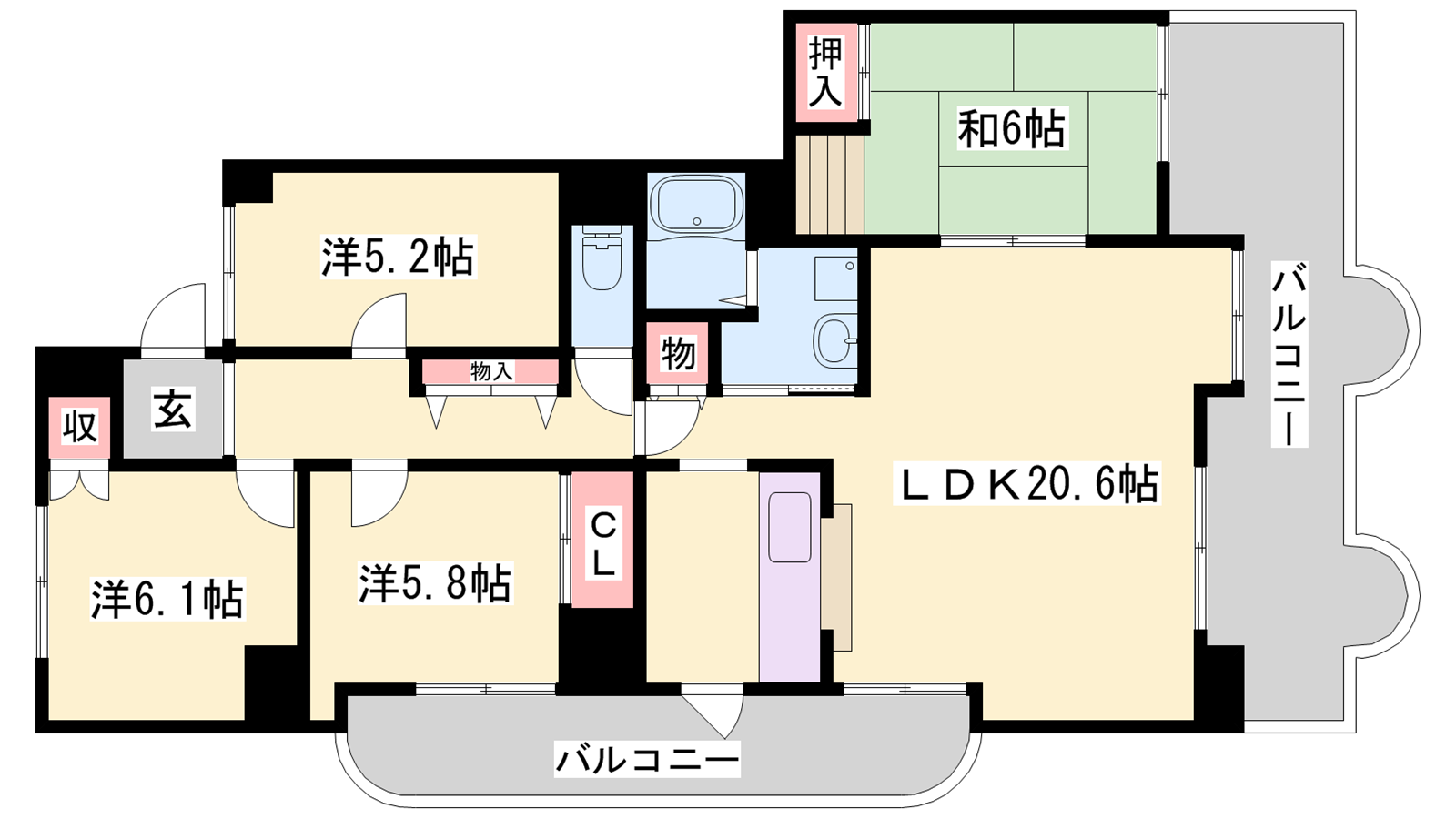 - LDK20.6帖、和室6帖、洋室6.1帖、洋室5.8帖、洋室5.2帖