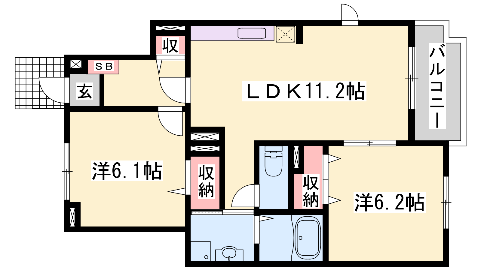 - LDK11.2帖、洋室6.2帖、洋室6.1帖
