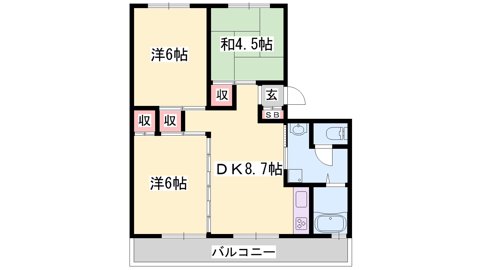 - DK8.7帖、洋室6帖、洋室6帖、和室4.5帖