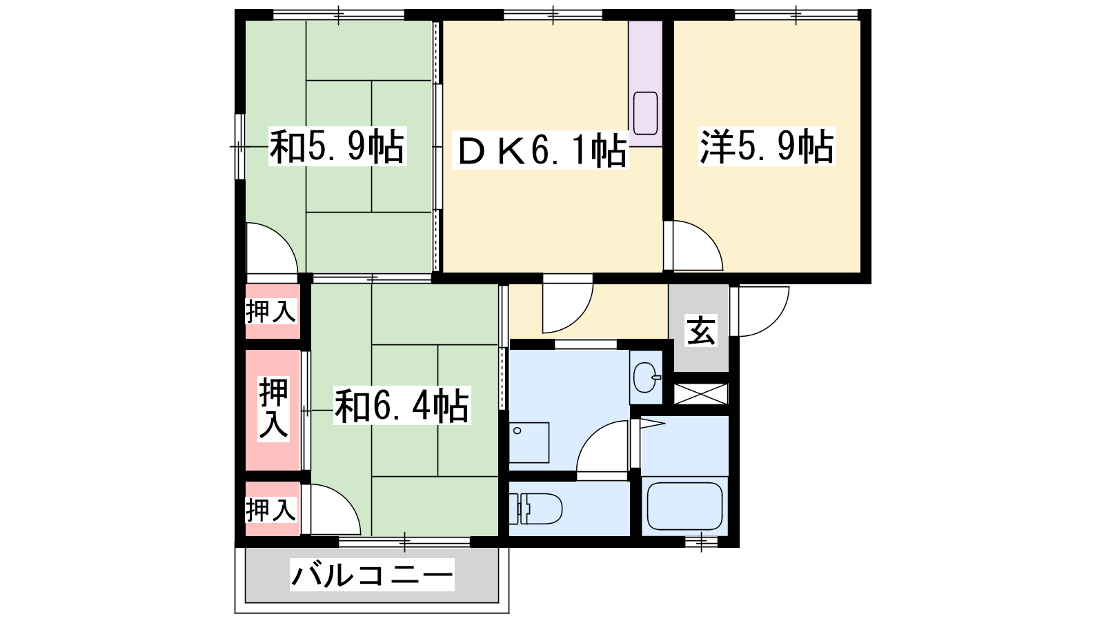 - DK6.1帖、洋室5.9帖、和室5.9帖、和室6.4帖