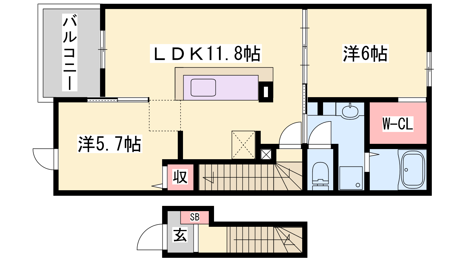 - K11.8帖、洋室6帖、洋室5.7帖