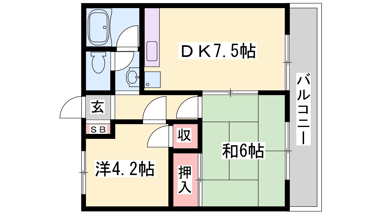 - DK7.5帖、洋室4.2帖、和室6帖