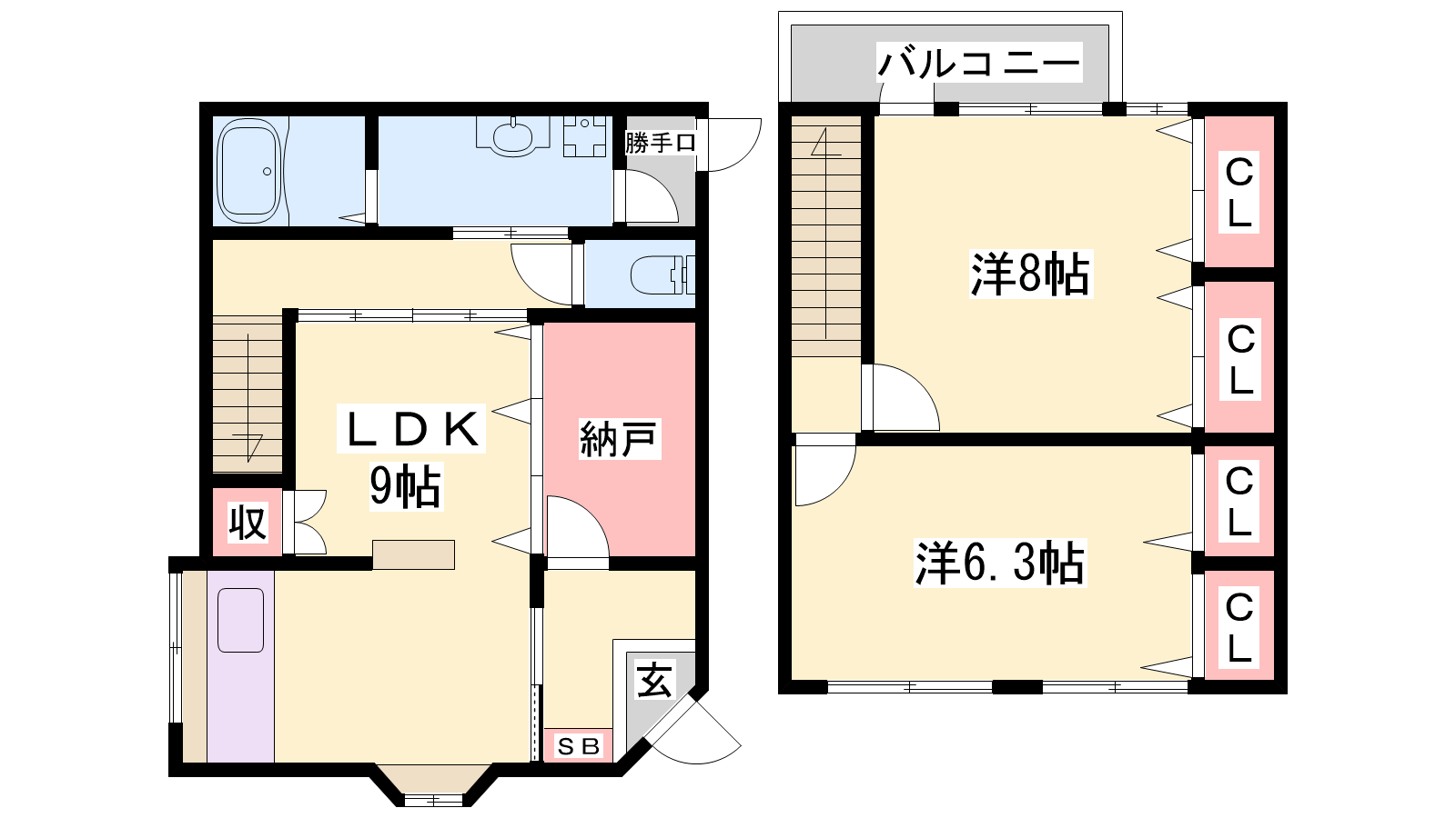 - LDK9帖、洋室8帖、洋室6.3帖