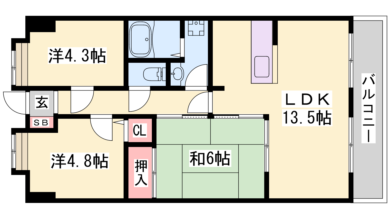 - LDK13.5帖、洋室4.8帖、洋室4.3帖、和室6帖