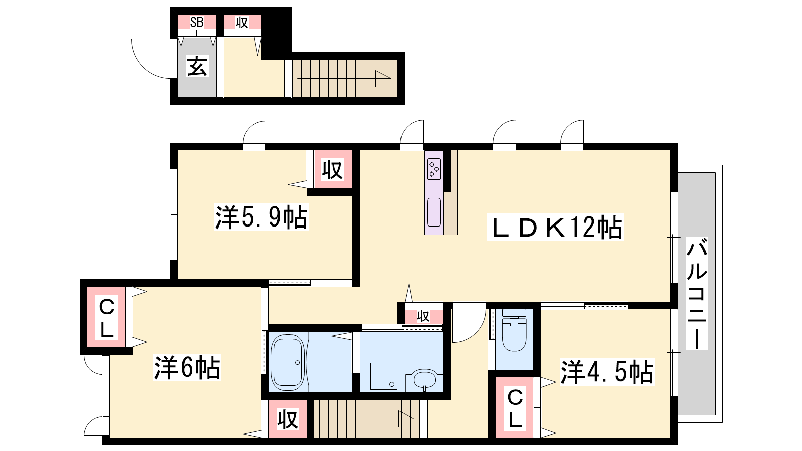 - LDK12帖、洋室6帖、洋室5.9帖、洋室4.5帖