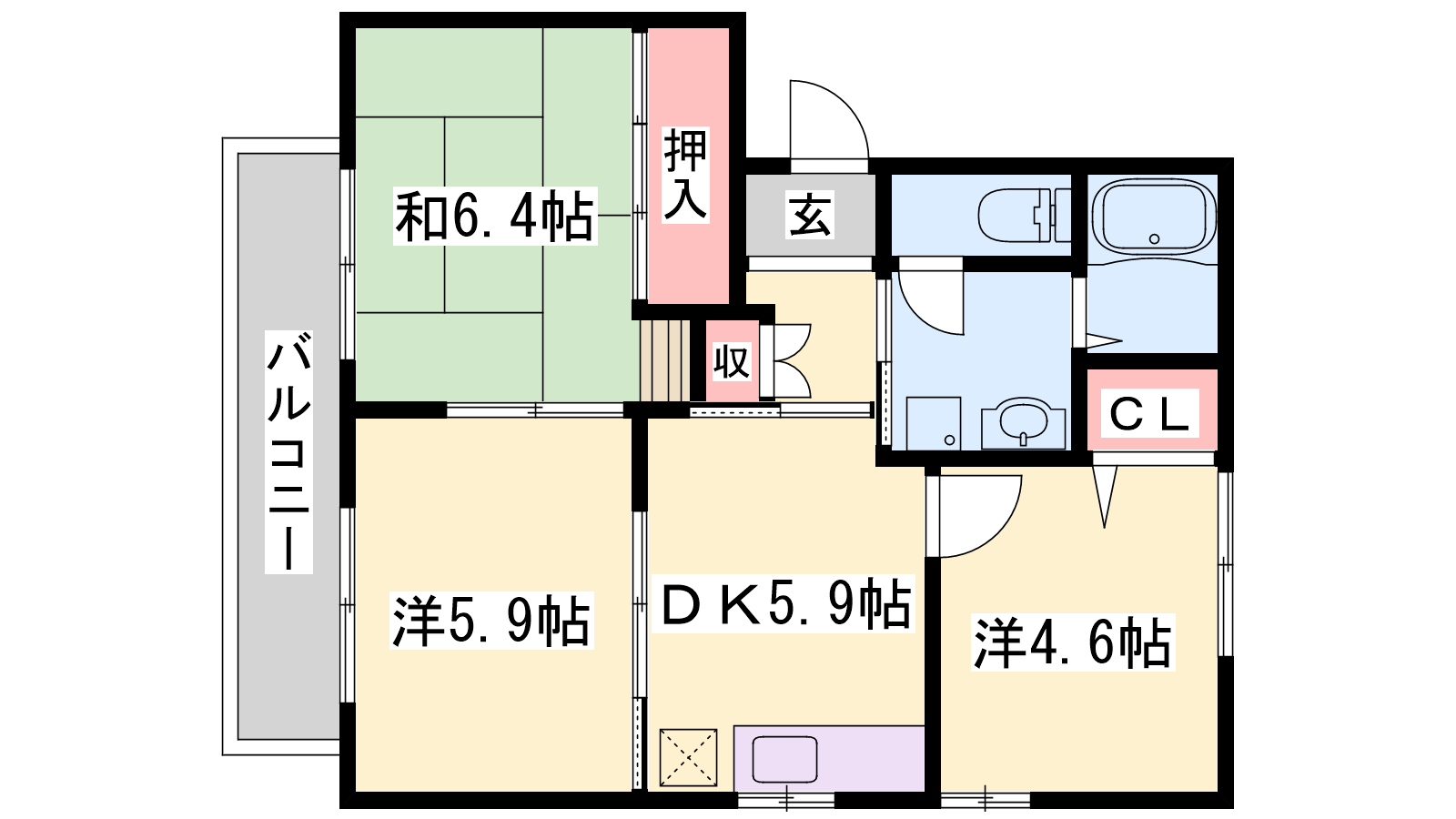 - K5.9帖、洋室5.9帖、洋室4.6帖、和室6.4帖