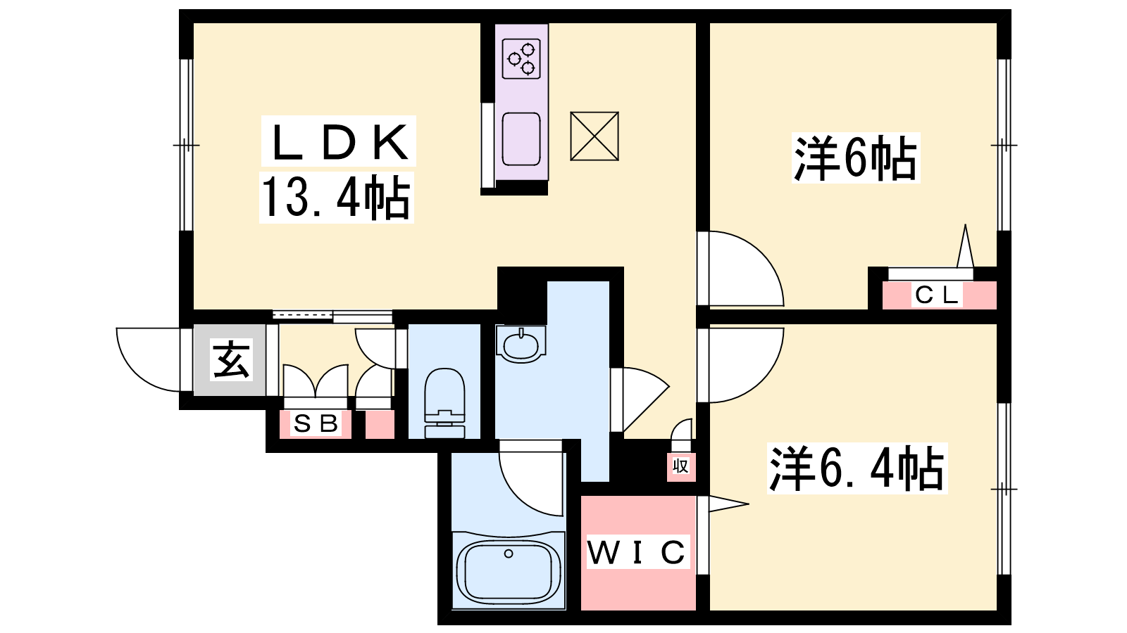 - LDK13.4帖、洋室6.4帖、洋室6帖