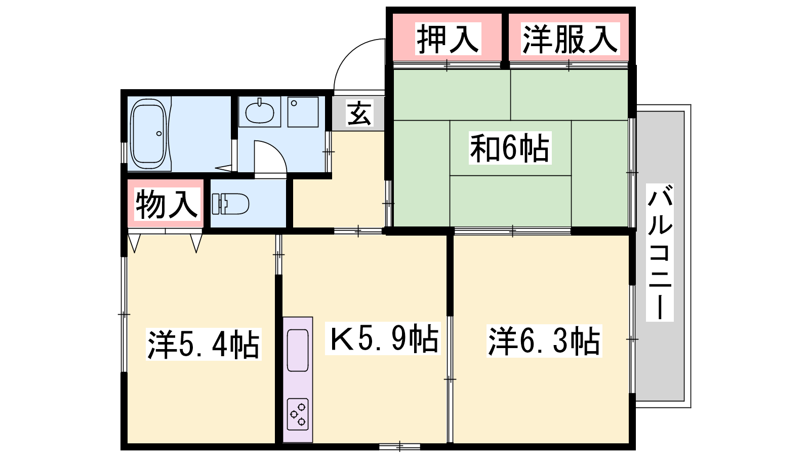 - K5.9帖、洋室6.3帖、洋室5.4帖、和室6帖