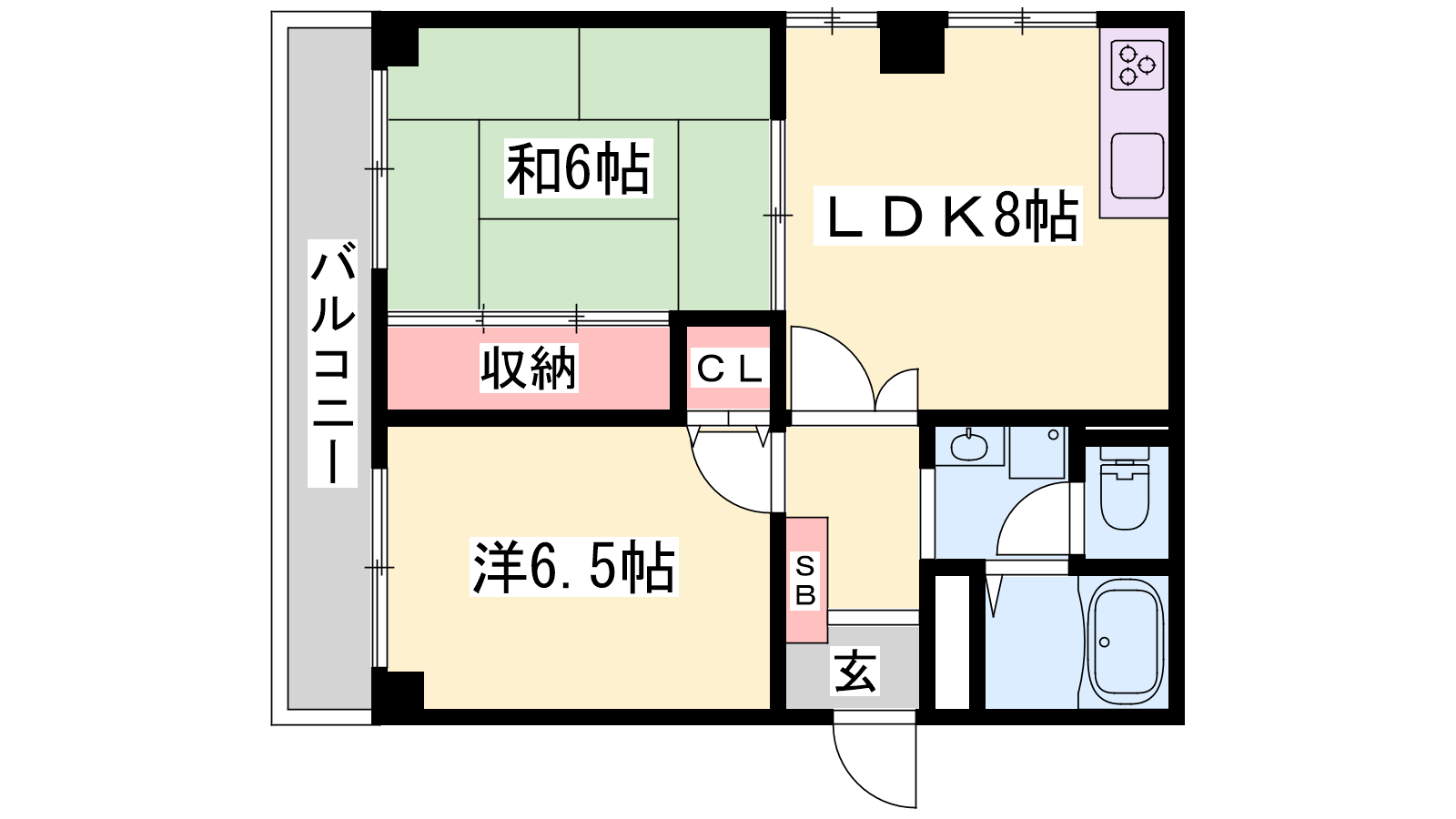 - LDK8帖、洋室6.5帖、和室6帖