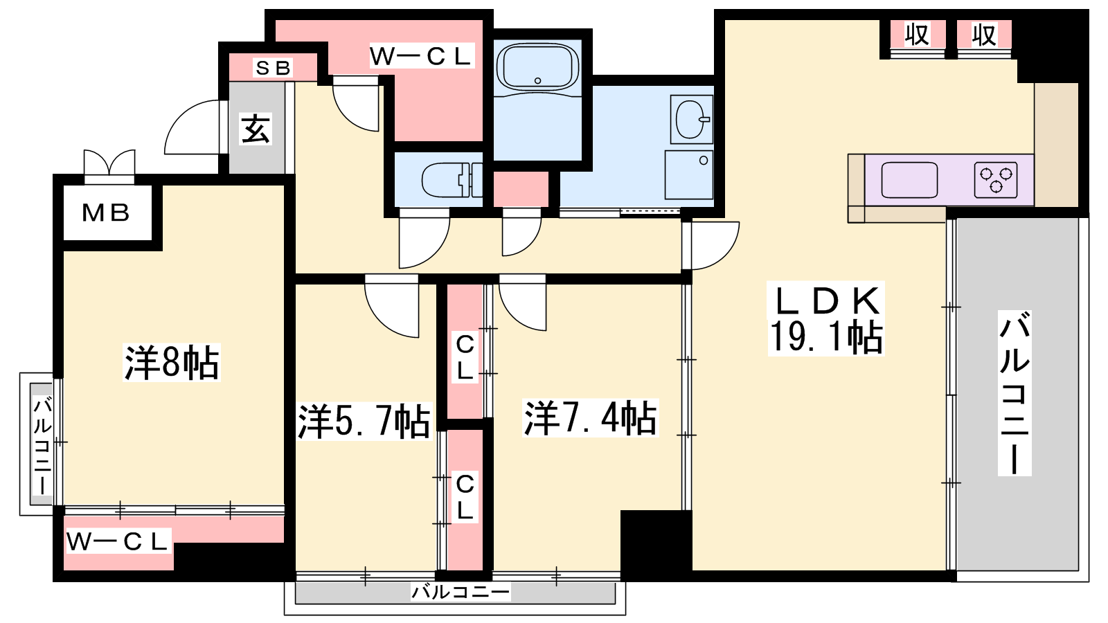 - LDK19.1帖、洋室8帖、洋室7.4帖、洋室5.7帖