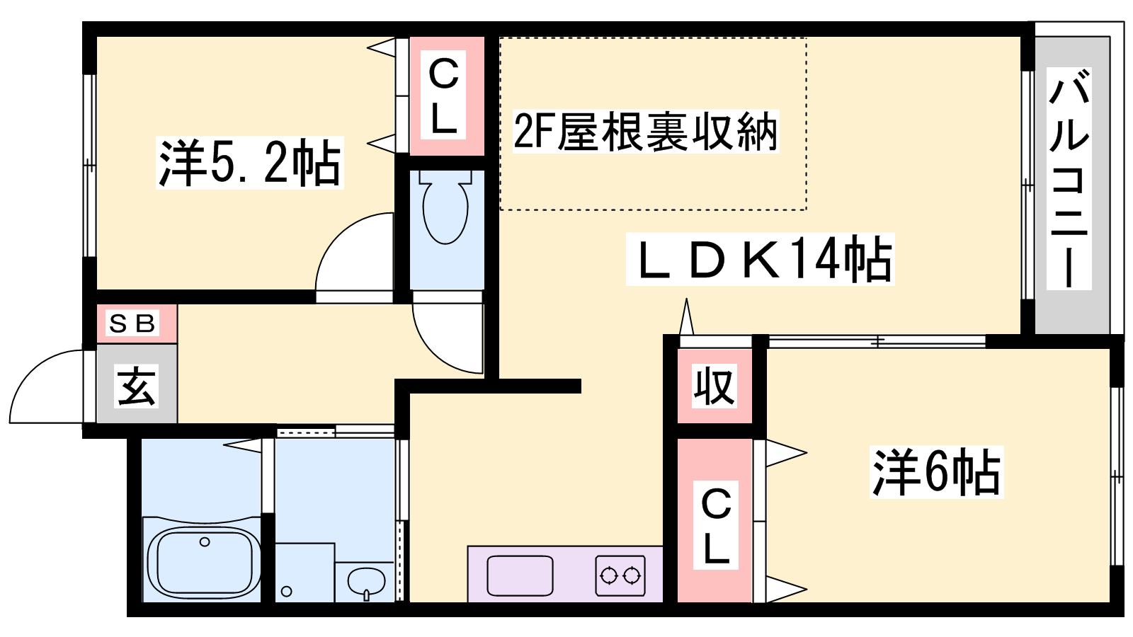 - LDK14帖、洋室6帖、洋室5.25帖
