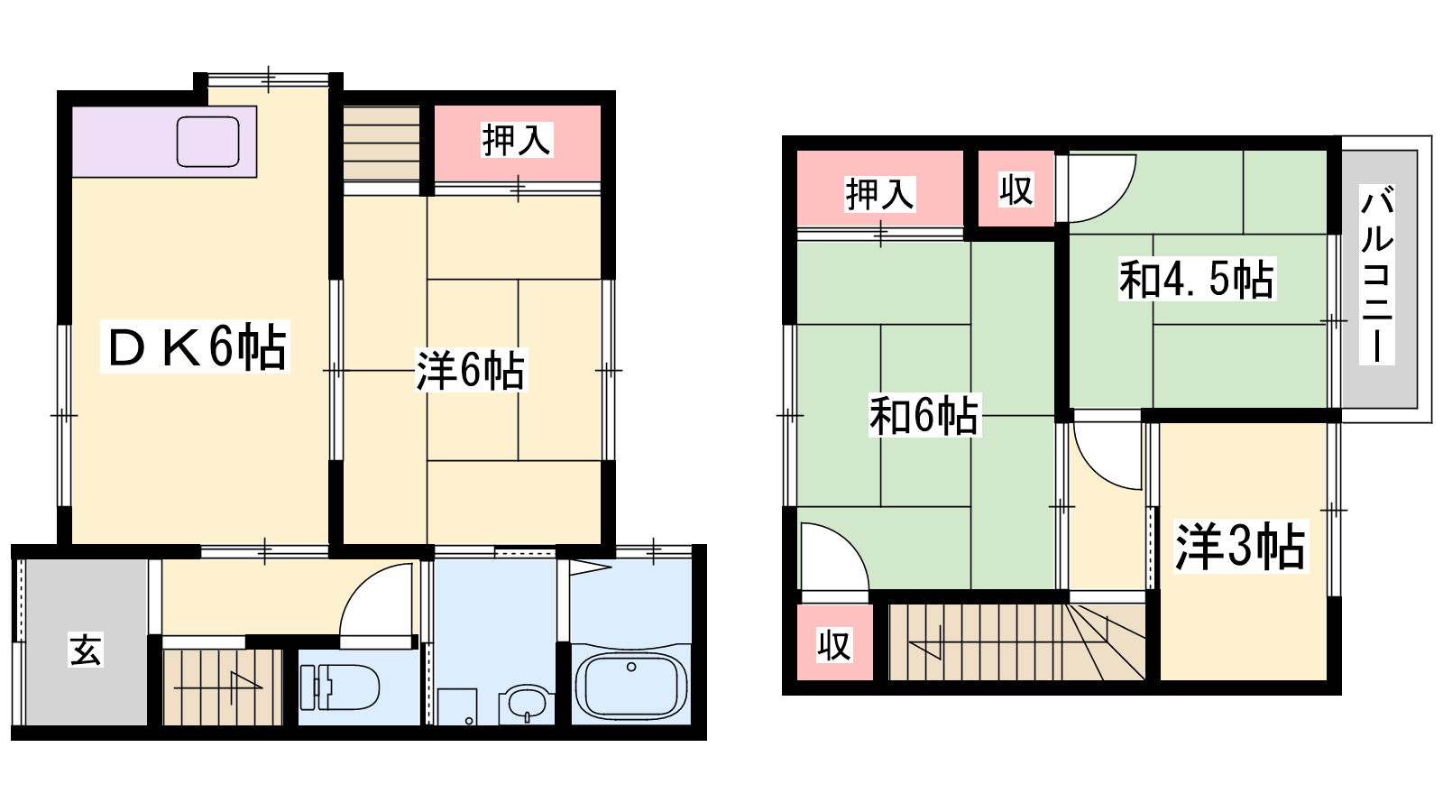 - DK6帖、和室6帖、和室6帖、和室4.5帖、洋室3帖