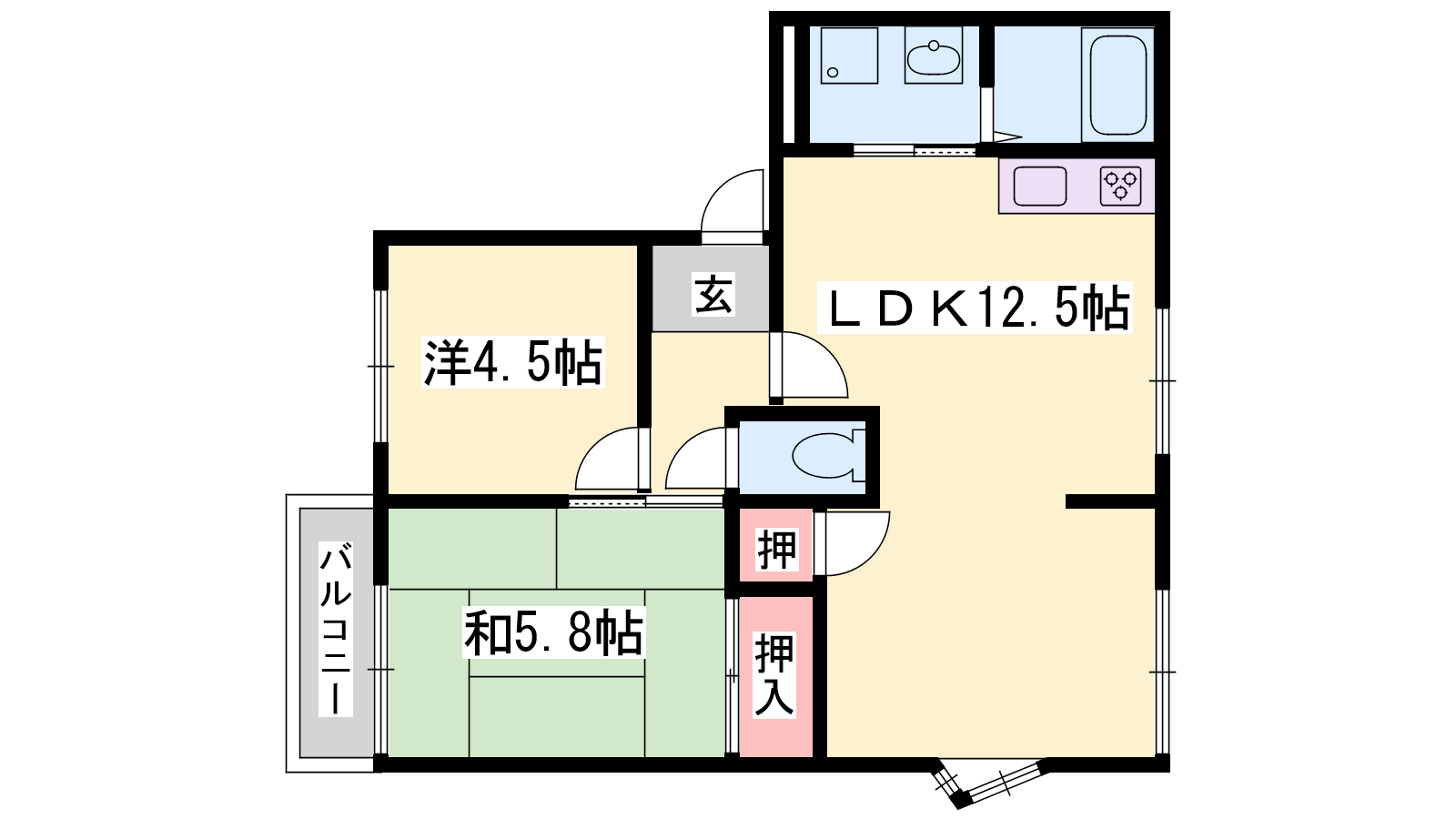 - LDK12.5帖、洋室4.5帖、和室5.8帖