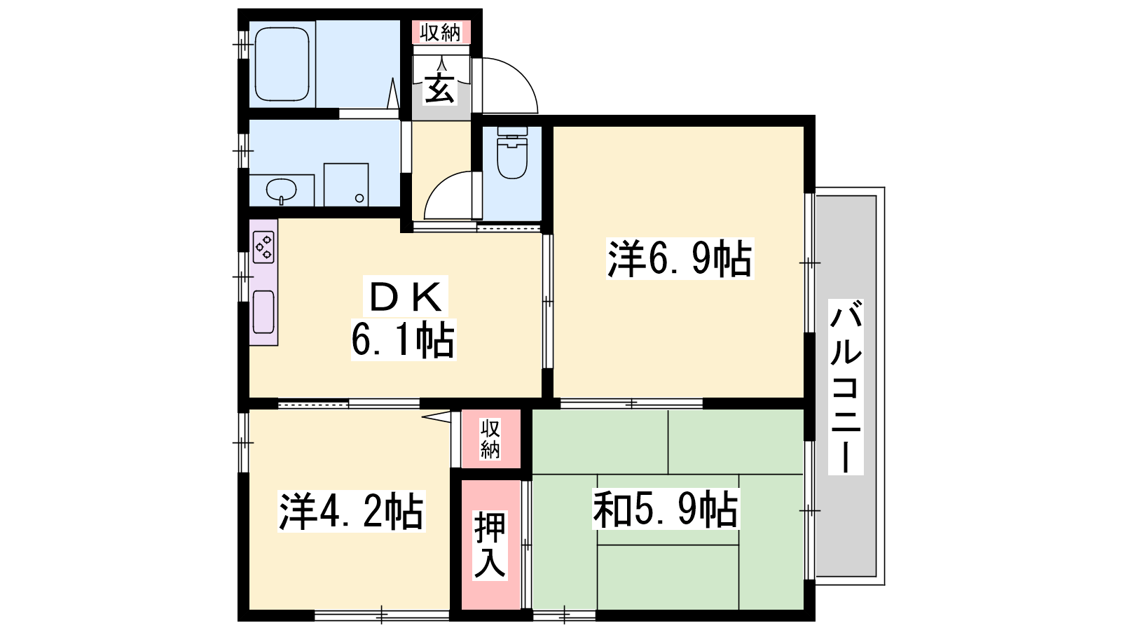 - DK6.1帖、洋室6.9帖、洋室4.2帖、和室5.9帖