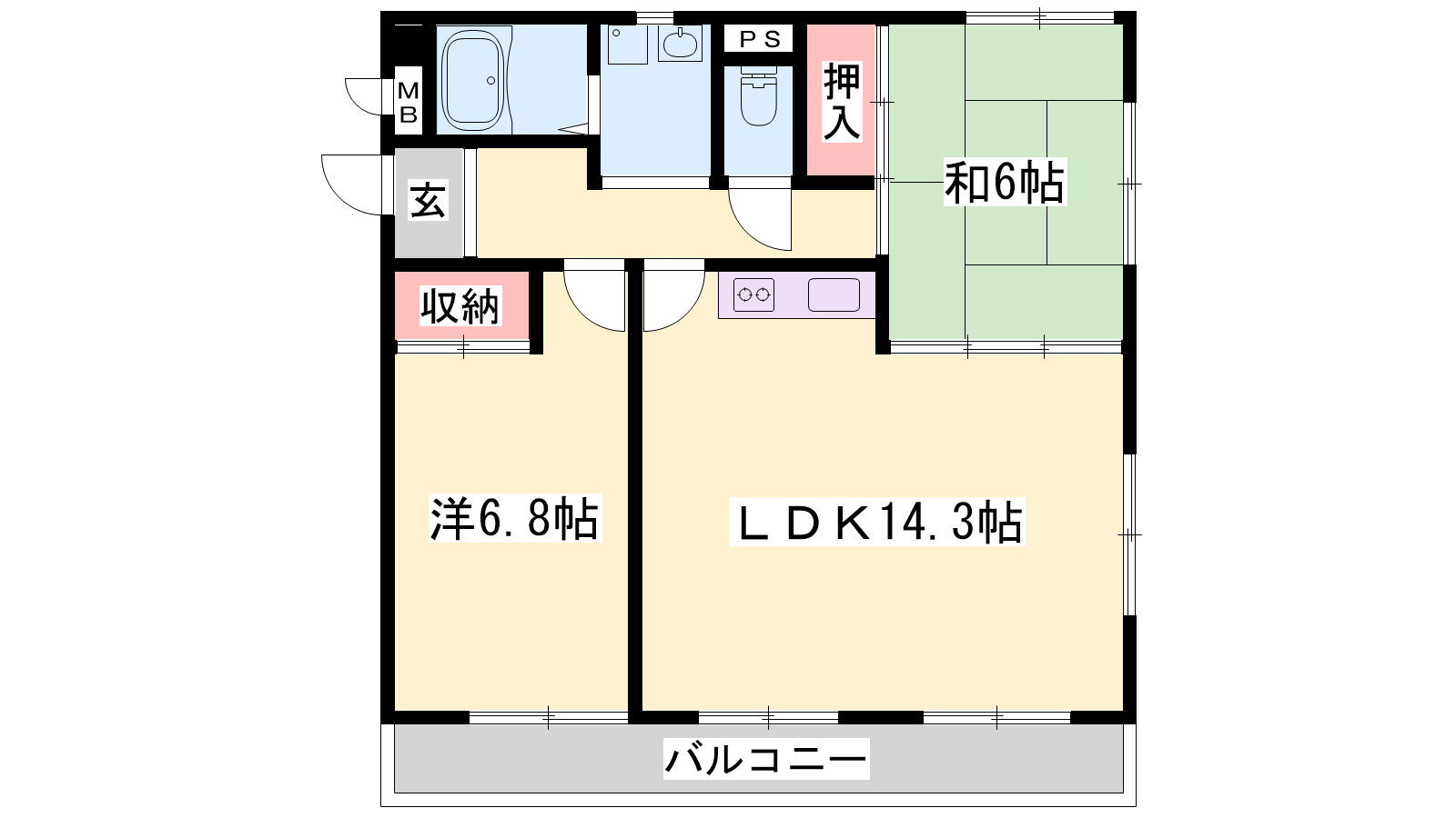 - LDK14.3帖、洋室6.8帖、和室6帖