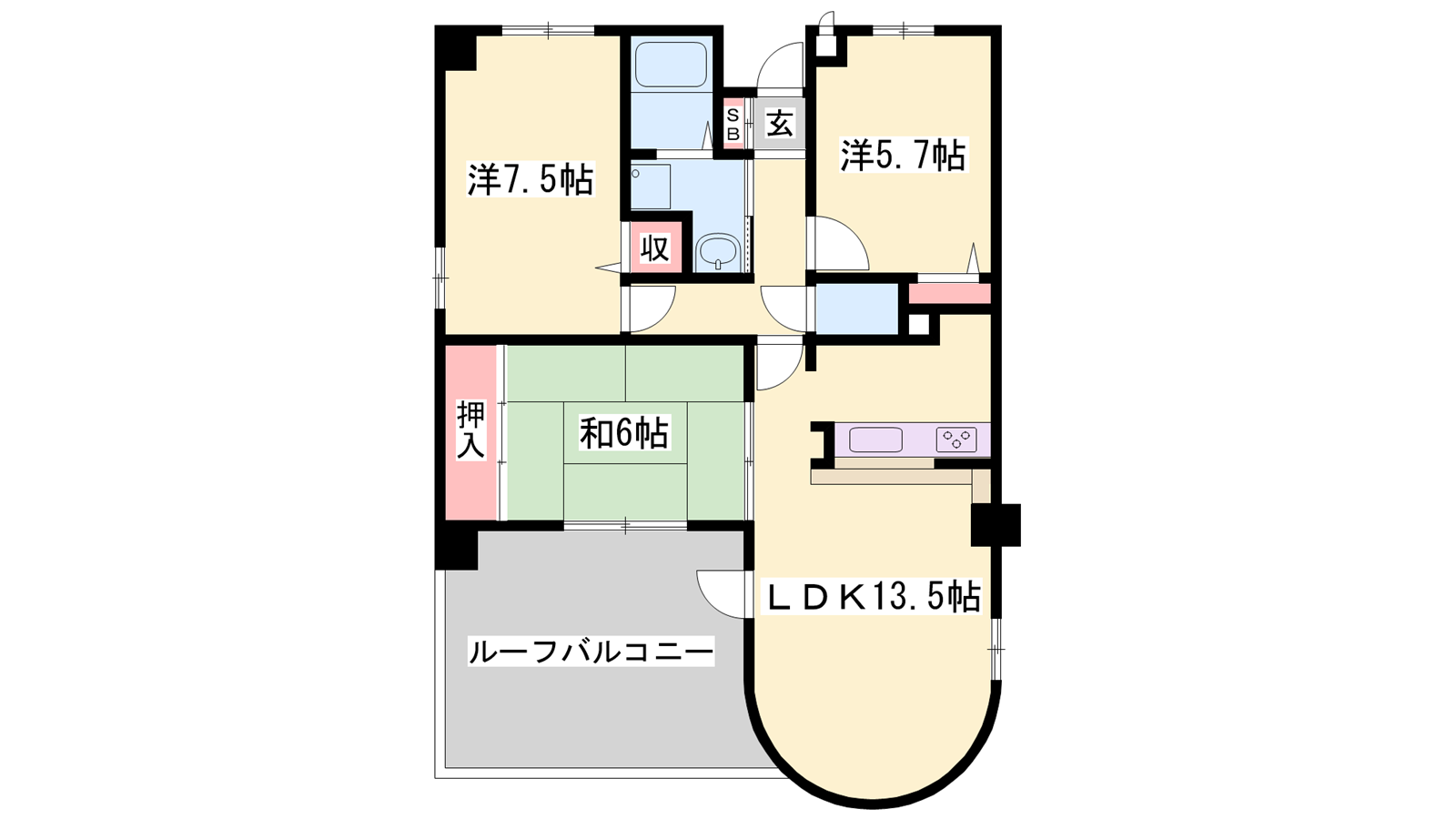 - LDK13.5帖、洋室7.5帖、洋室5.7帖、和室6帖