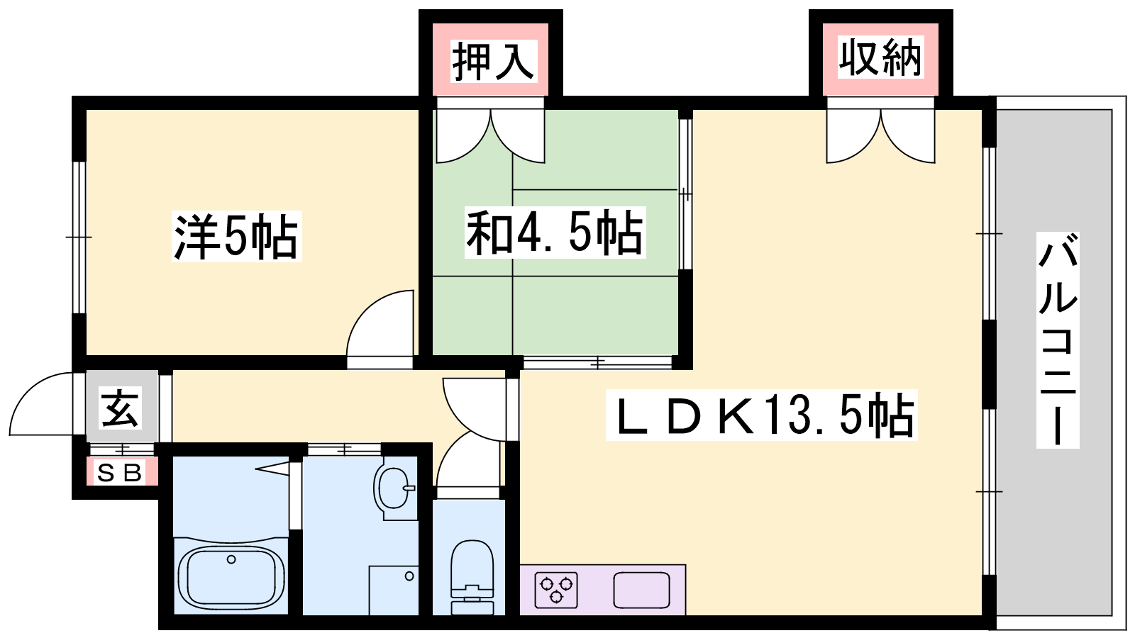 - LDK13.5帖、洋室5帖、和室4.5帖