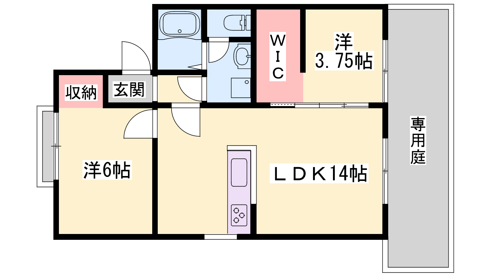 - LDK14帖、洋室6帖、洋室3.75帖