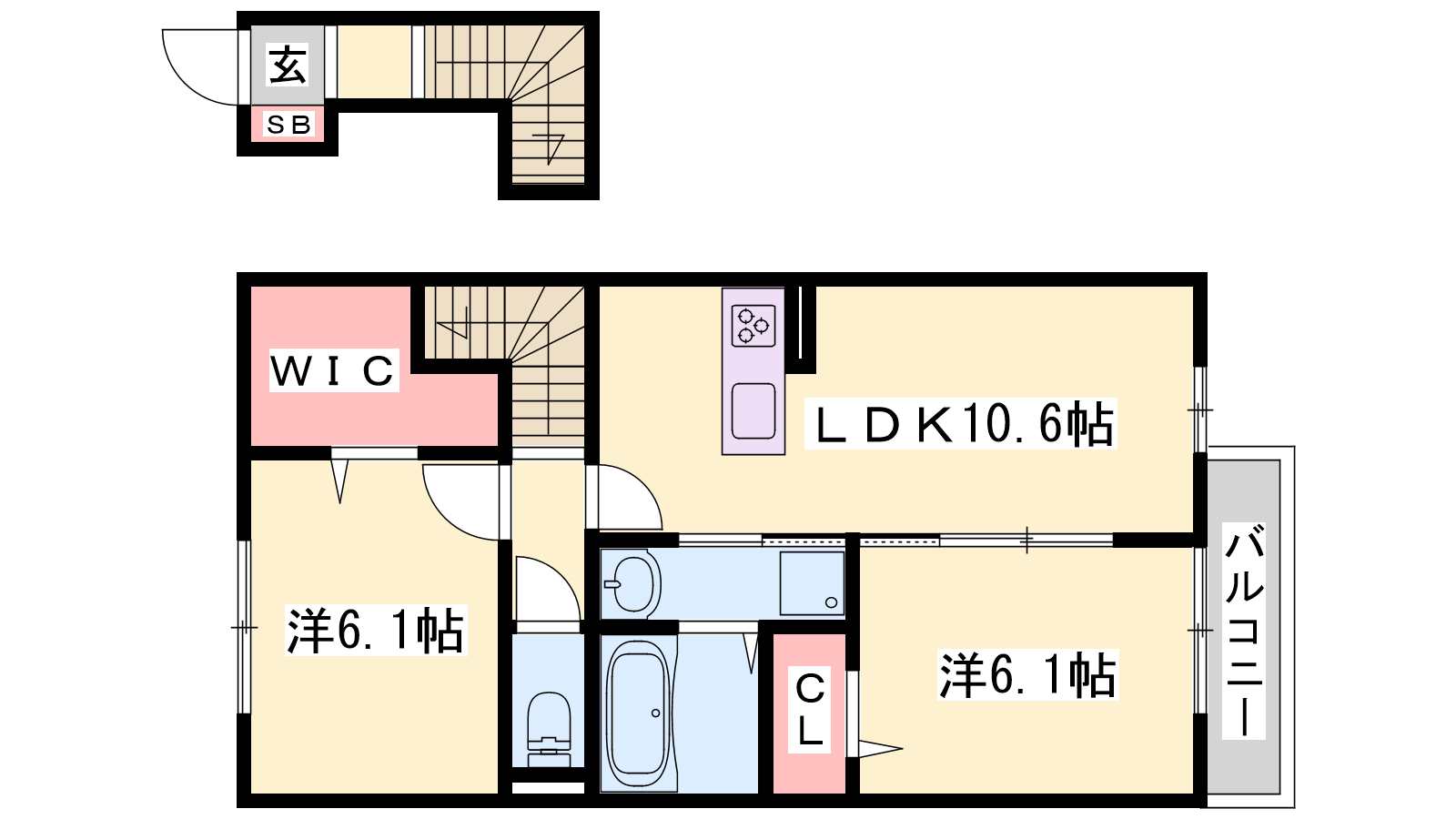 - LDK10.6帖、洋室6.1帖、洋室6.1帖