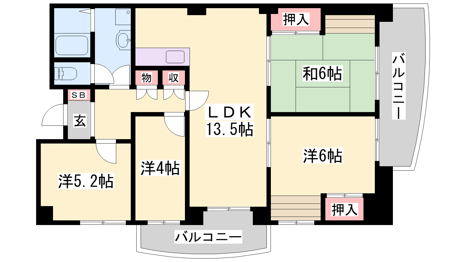 - LDK13.5帖、洋室5.2帖、洋室4帖、和室6帖、和室6帖