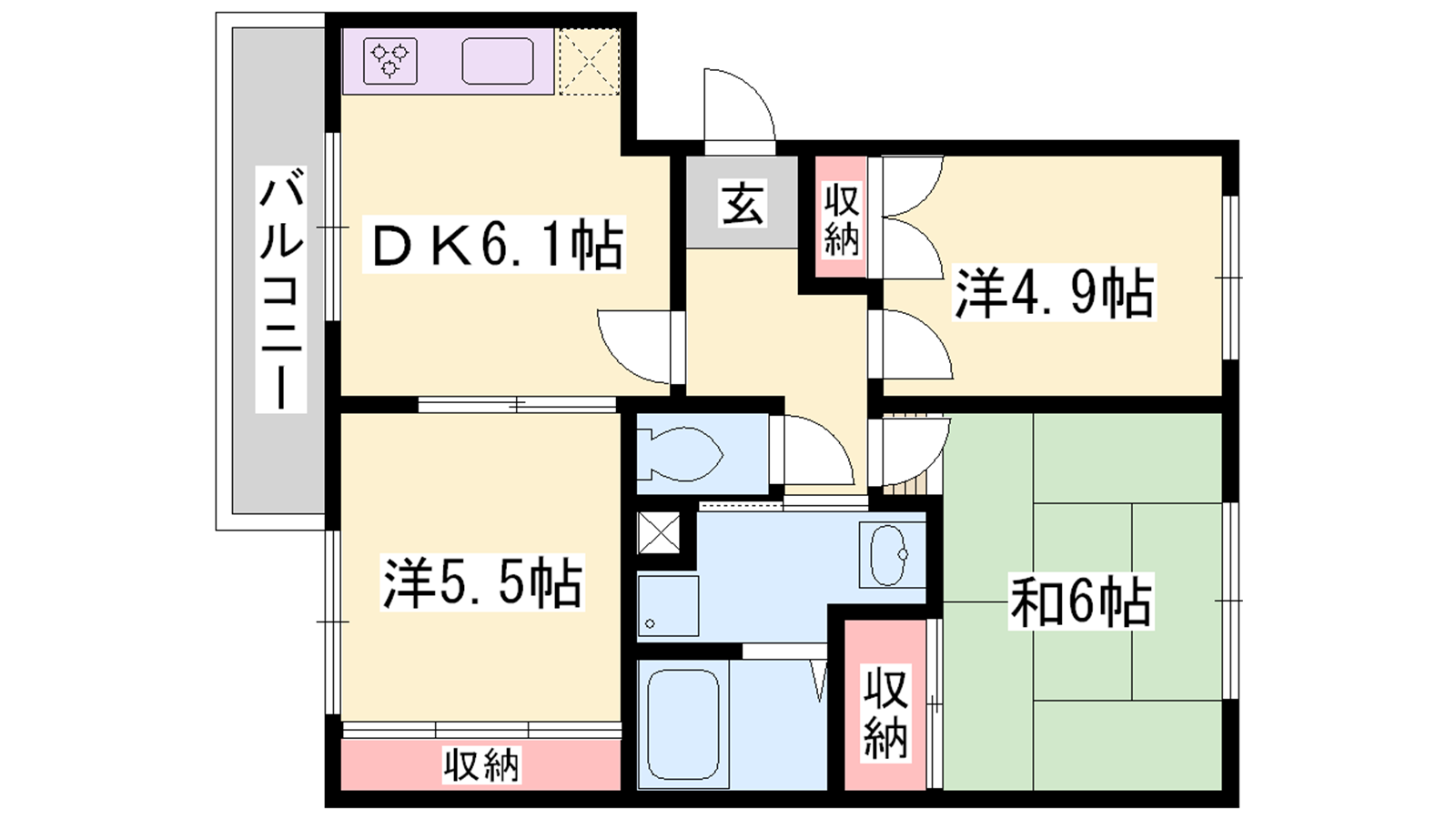 - DK6.1帖、洋室5.5帖、洋室4.9帖、和室6帖