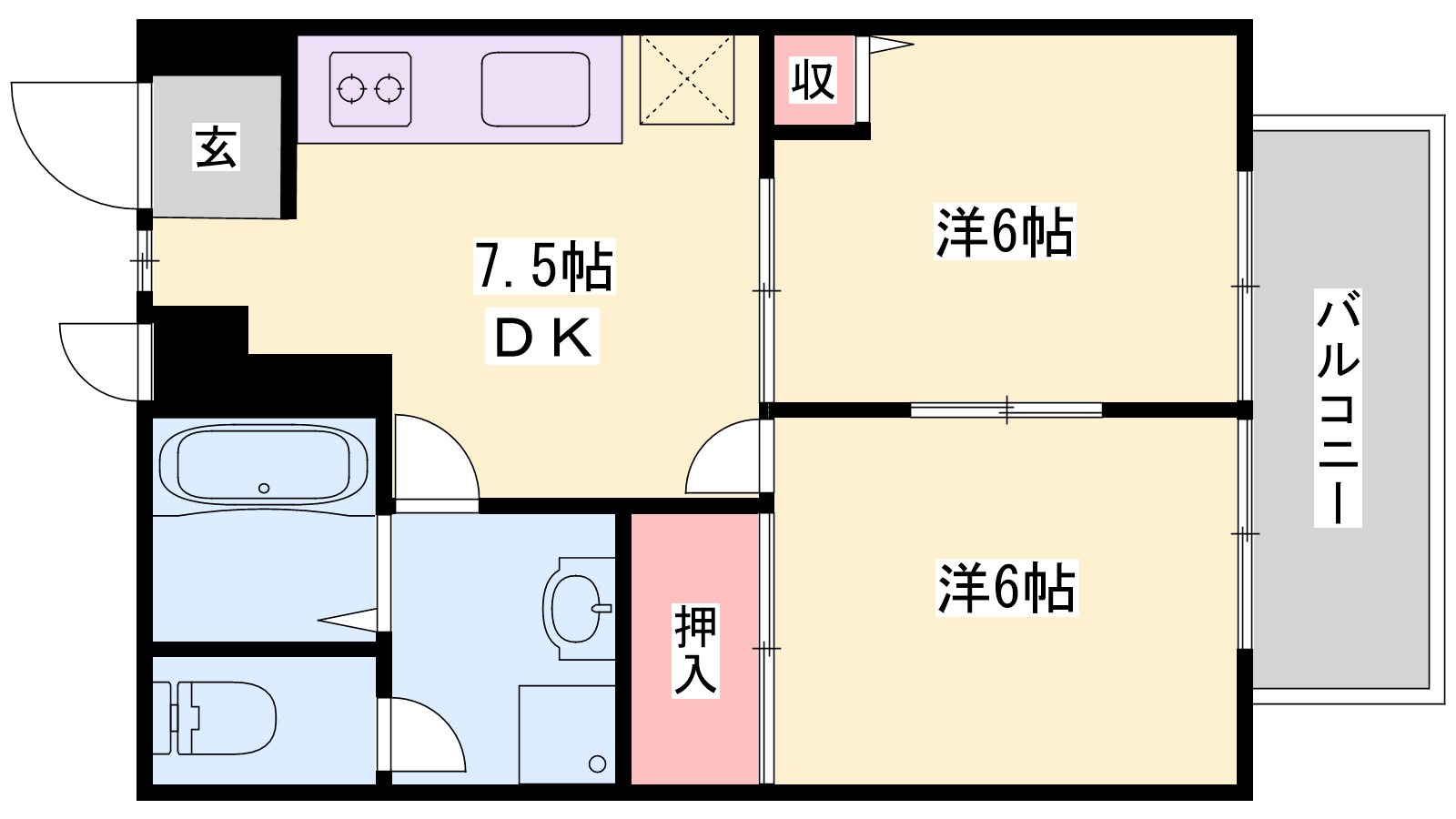 - DK7.5帖、洋室6帖、洋室6帖