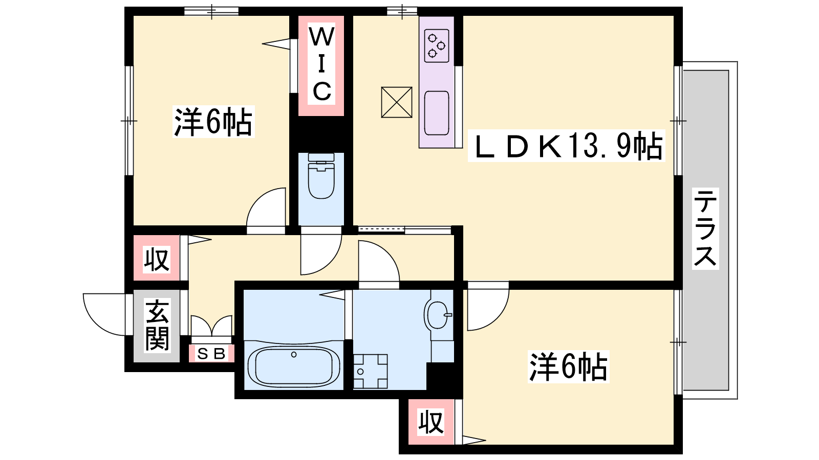 - LDK13.9帖、洋室6帖、洋室6帖