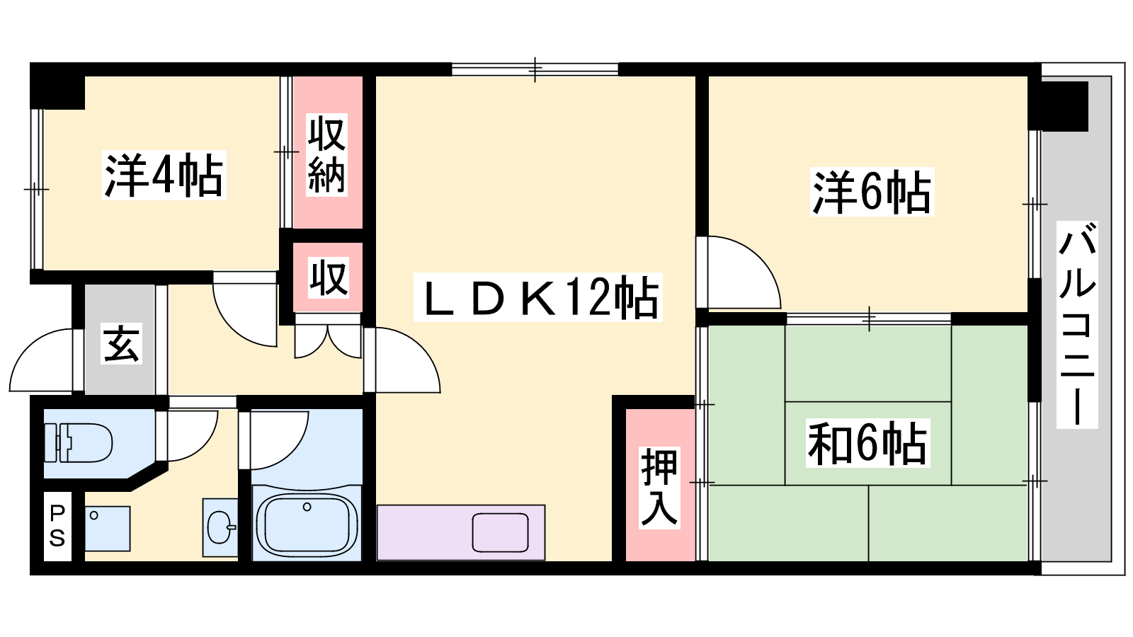 - LDK12帖、洋室6帖、洋室4帖、和室6帖