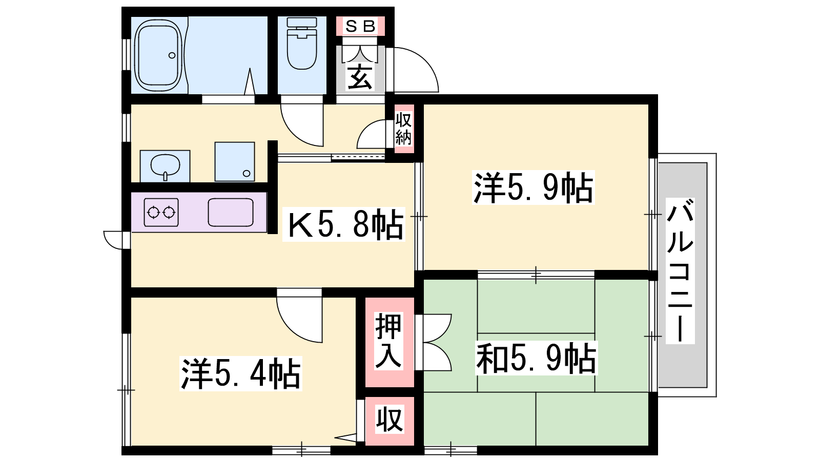 - K5.8帖、洋室5.4帖、洋室5.9帖、和室5.9帖