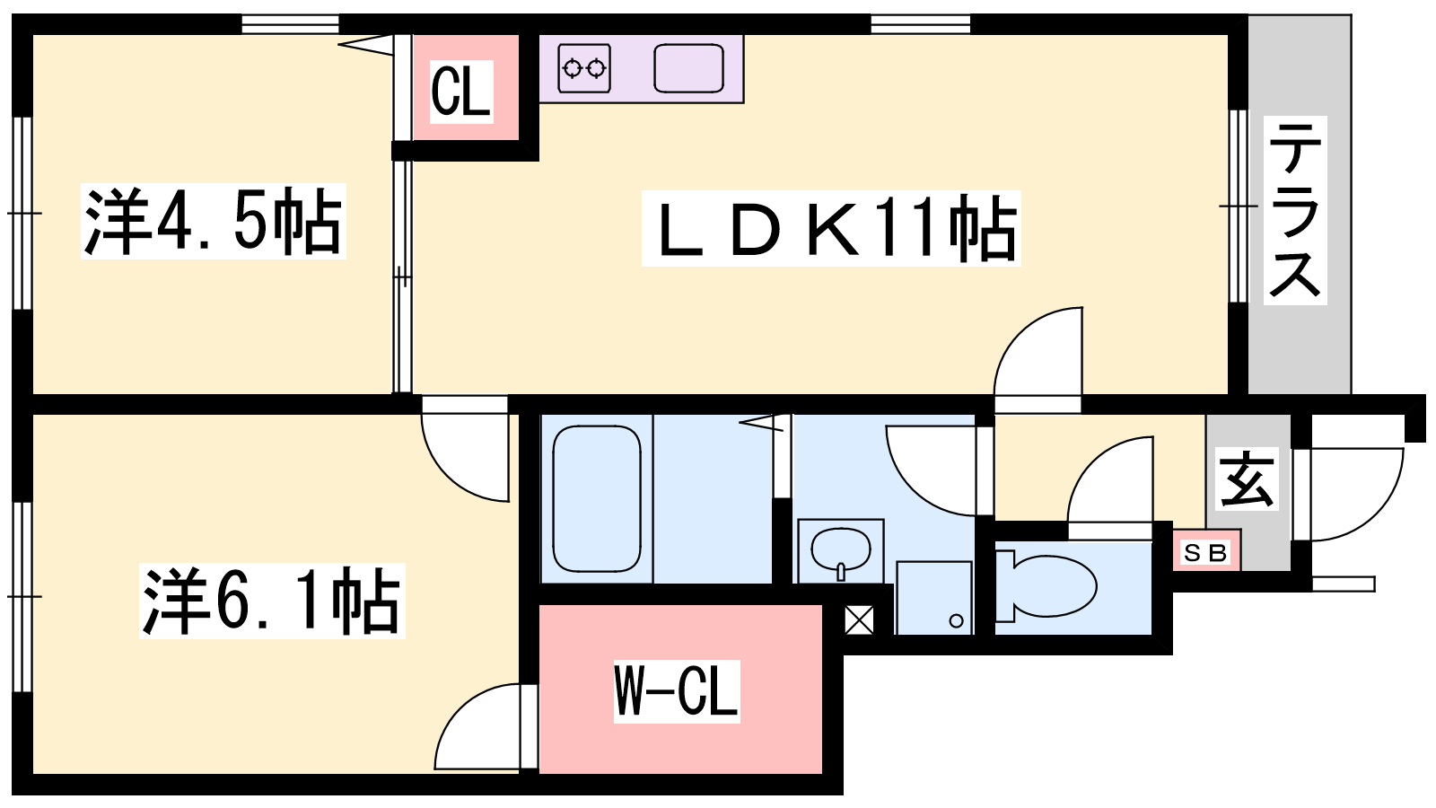 - LDK11帖、洋室6.1帖、洋室4.5帖